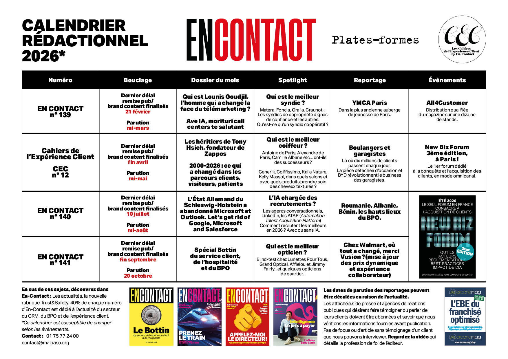 Dans les quatre numéros d'En-Contact cette année, découvrez une enquête sur ce et ceux qui transforment l'expérience client, grâce à leur joignabilité, la facilité offerte de prendre un rendez-vous, leur e-réputation. Pour rigoler, En-Contact a également prévu d'enrichir ses rubriques Spotlight avec quatre enquêtes, « Qui est le meilleur syndic ? », « Qui est le meilleur coiffeur si j'ai les cheveux texturés comme 60% de la population mondiale ? », « Lunettes Pour Tous est-il une arnaque ? » et « L'IA est chargée des recrutements. Est-ce une bonne chose ? ».