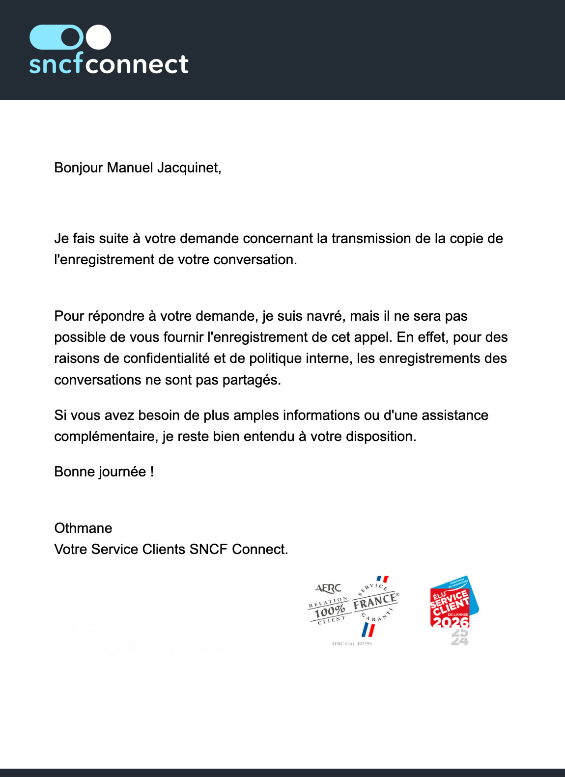 Hier, on a été, depuis Wasquehal semble-t-il, en relation avec une téléconseillère de Foundever pour une discussion qui s'est avérée compliquée. On a demandé, comme la loi le permet, une copie de la conversation tenue. La réponse de SNCF Connect a été fantaisiste et, plus grave, illégale : on nous a opposé un refus de fournir la conversation.