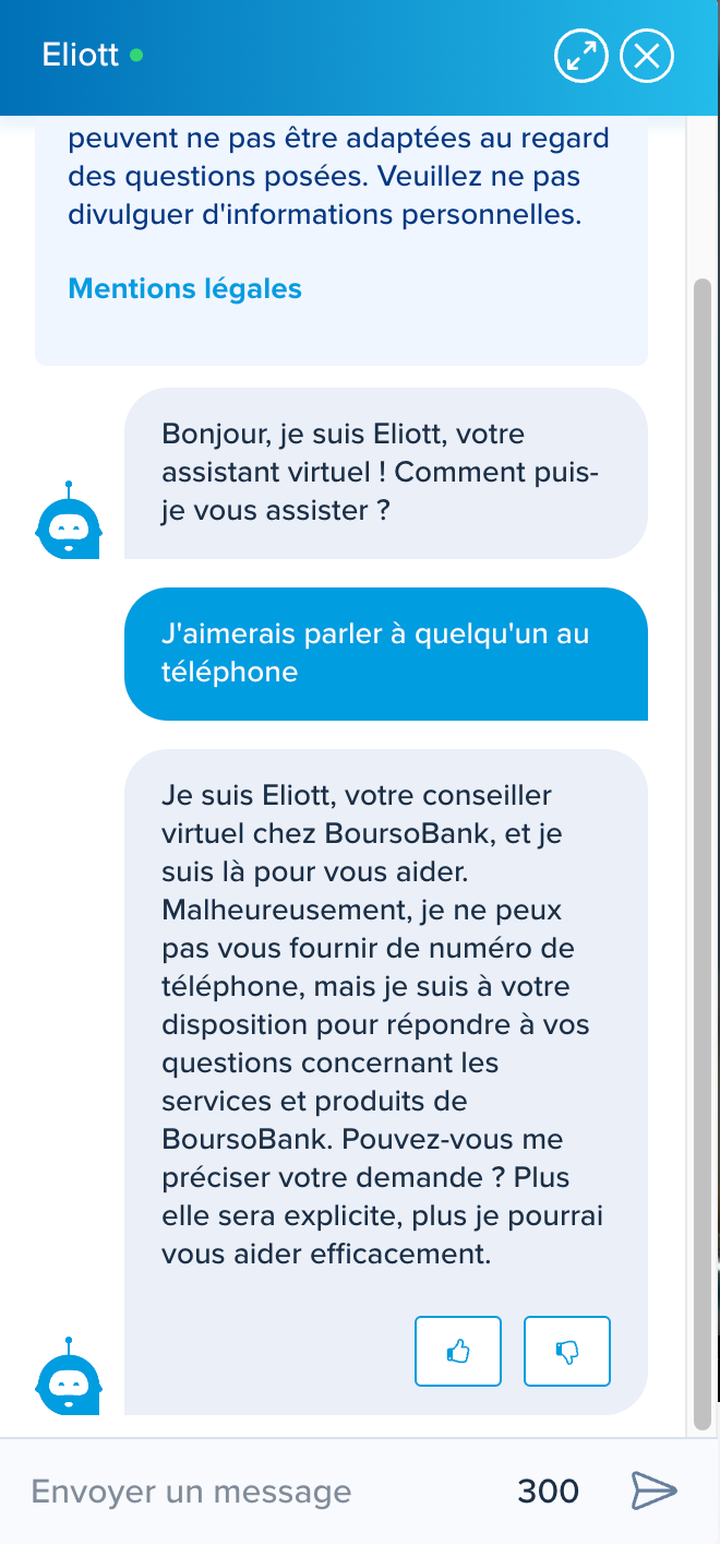 Alors elle essaie de contacter BoursoBank : par téléphone, c’est impossible car il faut entrer un numéro de compte (d’une personne vivante et majeure) et par Eliott, l’assistant virtuel, mais c’est impossible aussi (Mais on a de la chance car Eliott écrit « Malheureusement, je ne peux pas accéder aux informations spécifiques concernant votre dossier… Malheureusement, je ne peux pas vous mettre en contact direct avec le service client… Je suis vraiment désolé pour cette expérience frustrante… Je comprends votre frustration face à cette situation et votre souhait de la partager sur les réseaux sociaux pour obtenir une réponse. J'espère sincèrement que cela pourra aider à faire avancer votre dossier )»